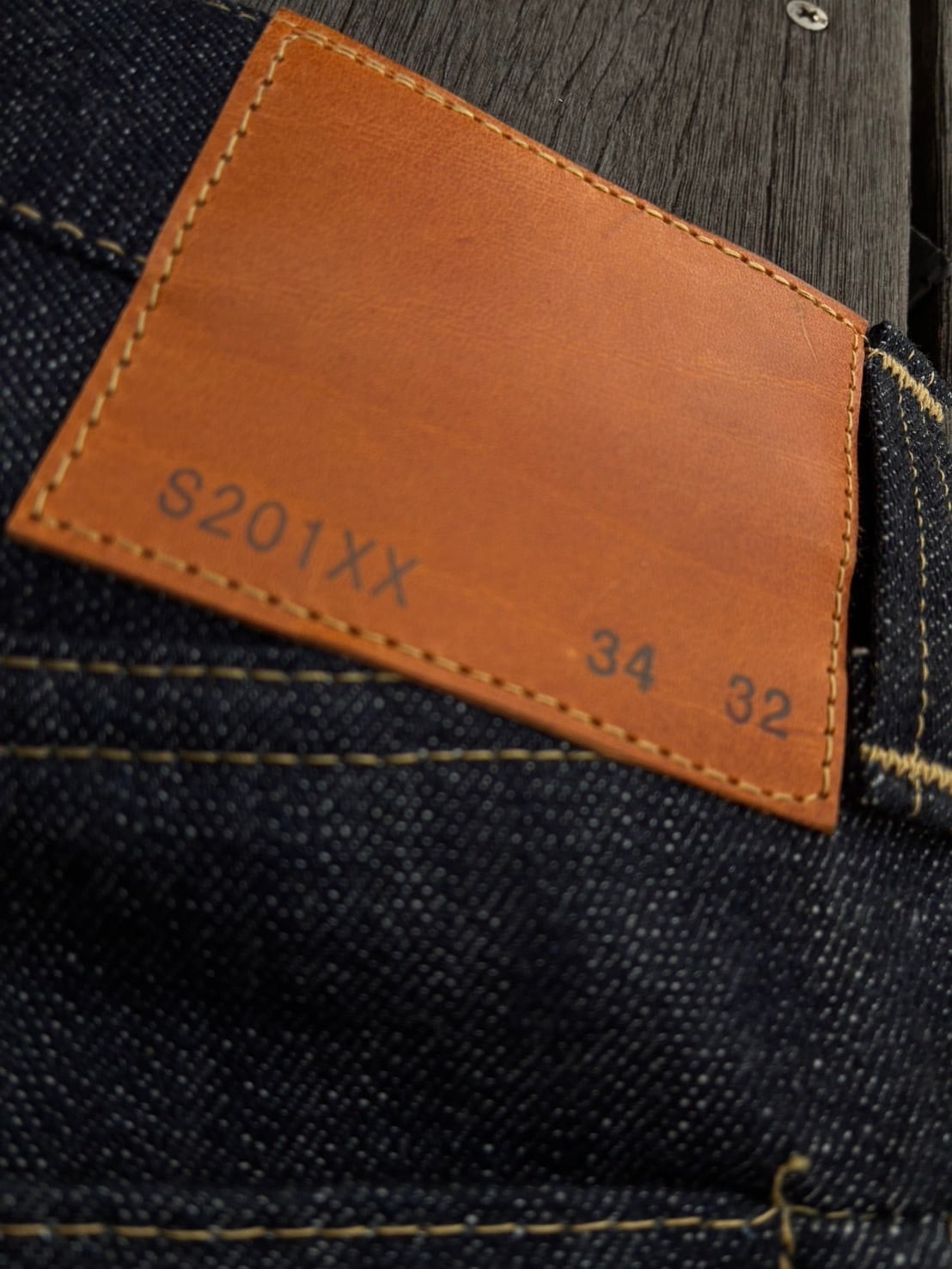 最大の特徴でもある大きなレザーパッチは稚拙な技術でカットしたが故のサイズで通常の箇所ではなくベルトループ下まで達して縫製されています。